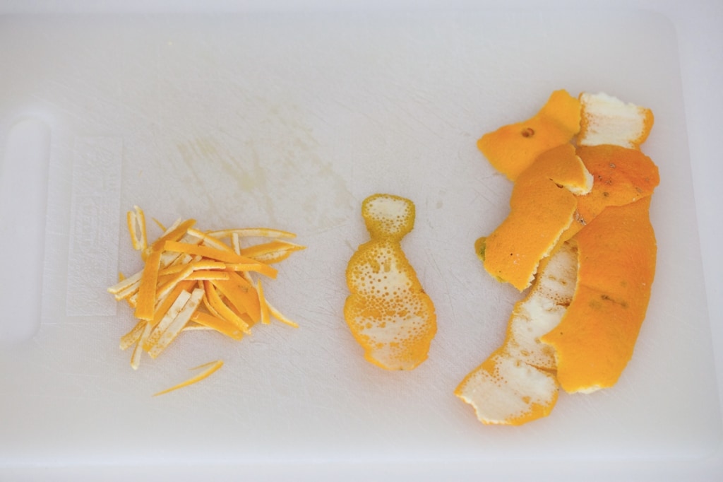 Scolate le bucce di arancia bollite per tre. Trascorse le 12 ore asciugate le arance e con un coltello tagliate la buccia poi delicatamente cercate di eliminare la paste bianca dalla. Ricaviamo la scorza con un coltello facendo attenzione a non intaccare anche la parte bianca.